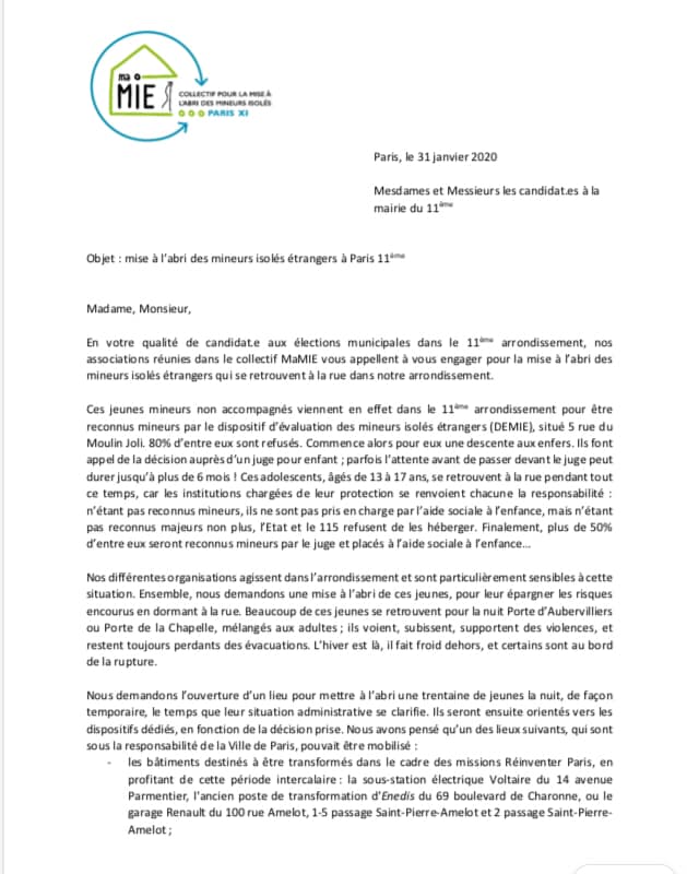 Face au silence institutionnel, le collectif MaMie décide de rendre publique la lettre et de l’adresser le 31 janvier 2020à l’ensemble des candidat·es à la mairie du 11ᵉ;